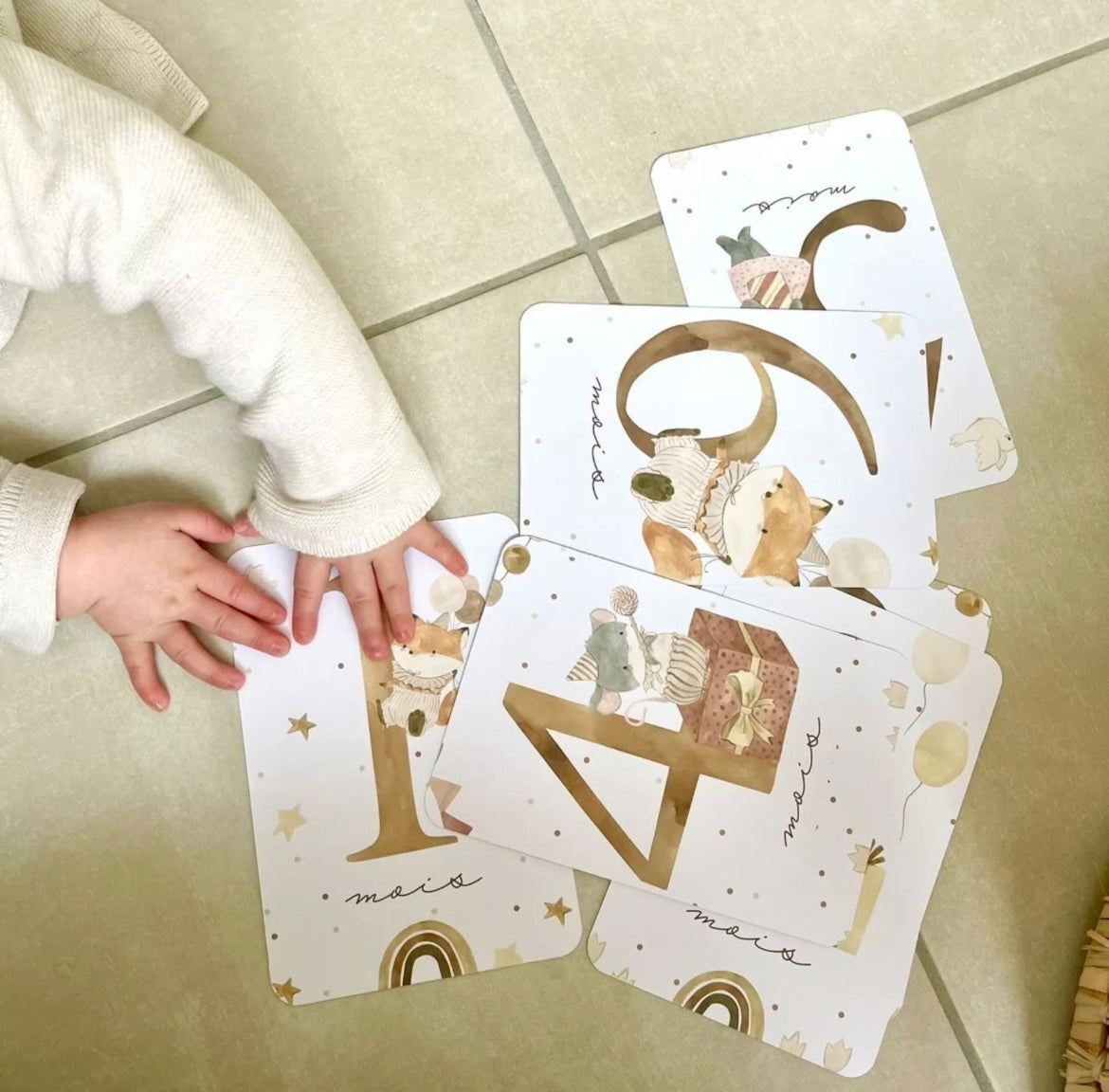 Cartes étapes toutes douces, dans des tons blancs et beiges avec de jolis animaux en aquarelle pour fêter les mois anniversaires de votre bébé, de sa naissance jusqu’à ses 1 an.