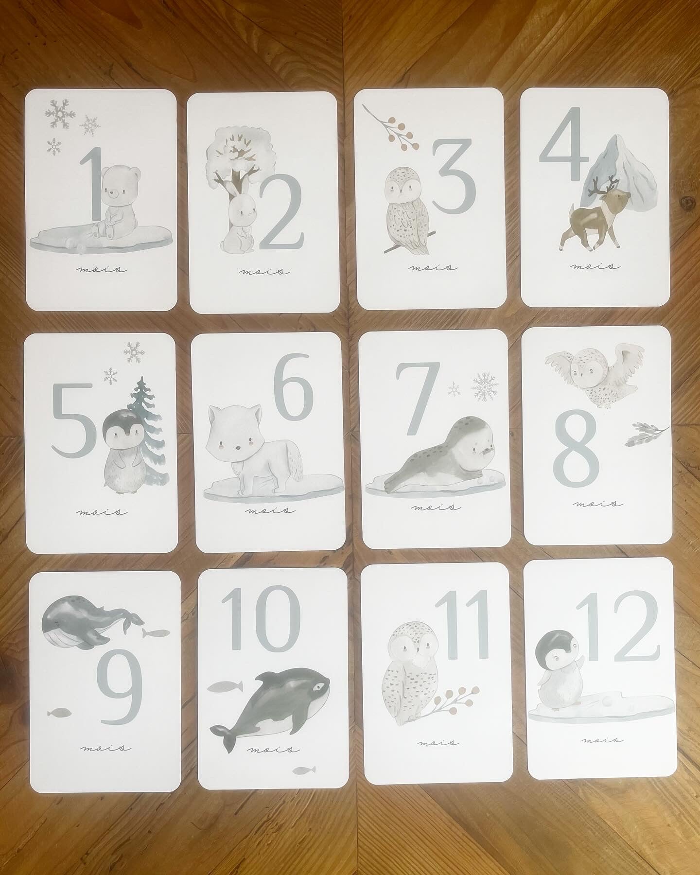 Cartes étapes toutes douces, dans des tons blancs et bleus avec de jolis motifs des animaux du pôle nord pour fêter les mois anniversaires de votre bébé, de sa naissance jusqu’à ses 1 an.