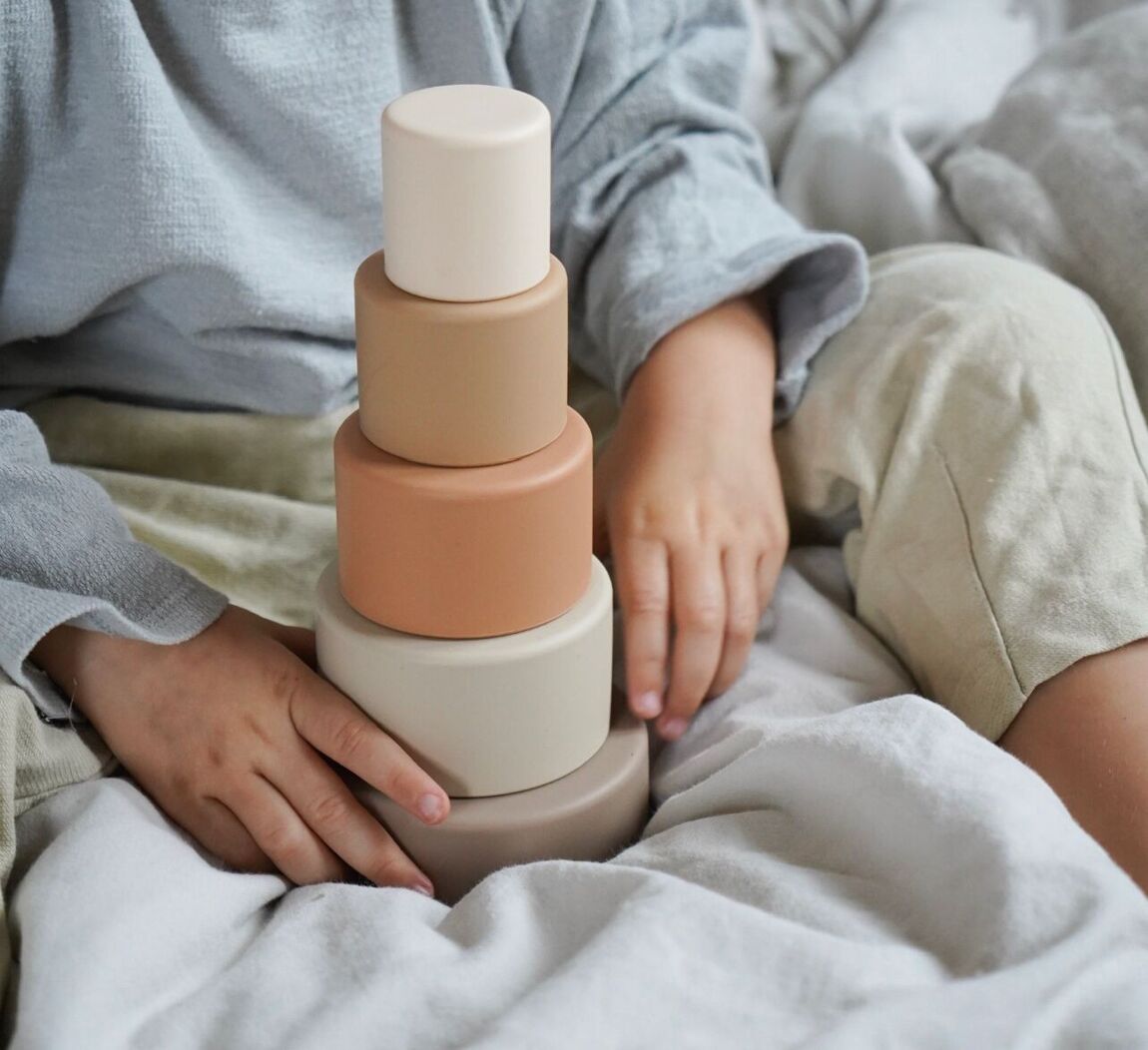 Agréable à manipuler, le Cup Stacker est un jouet en silicone - sans plastique ni substance indésirable.