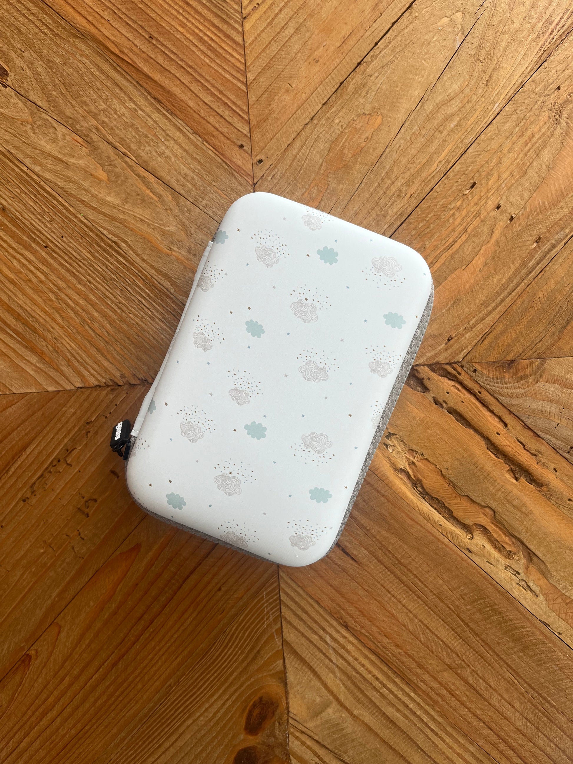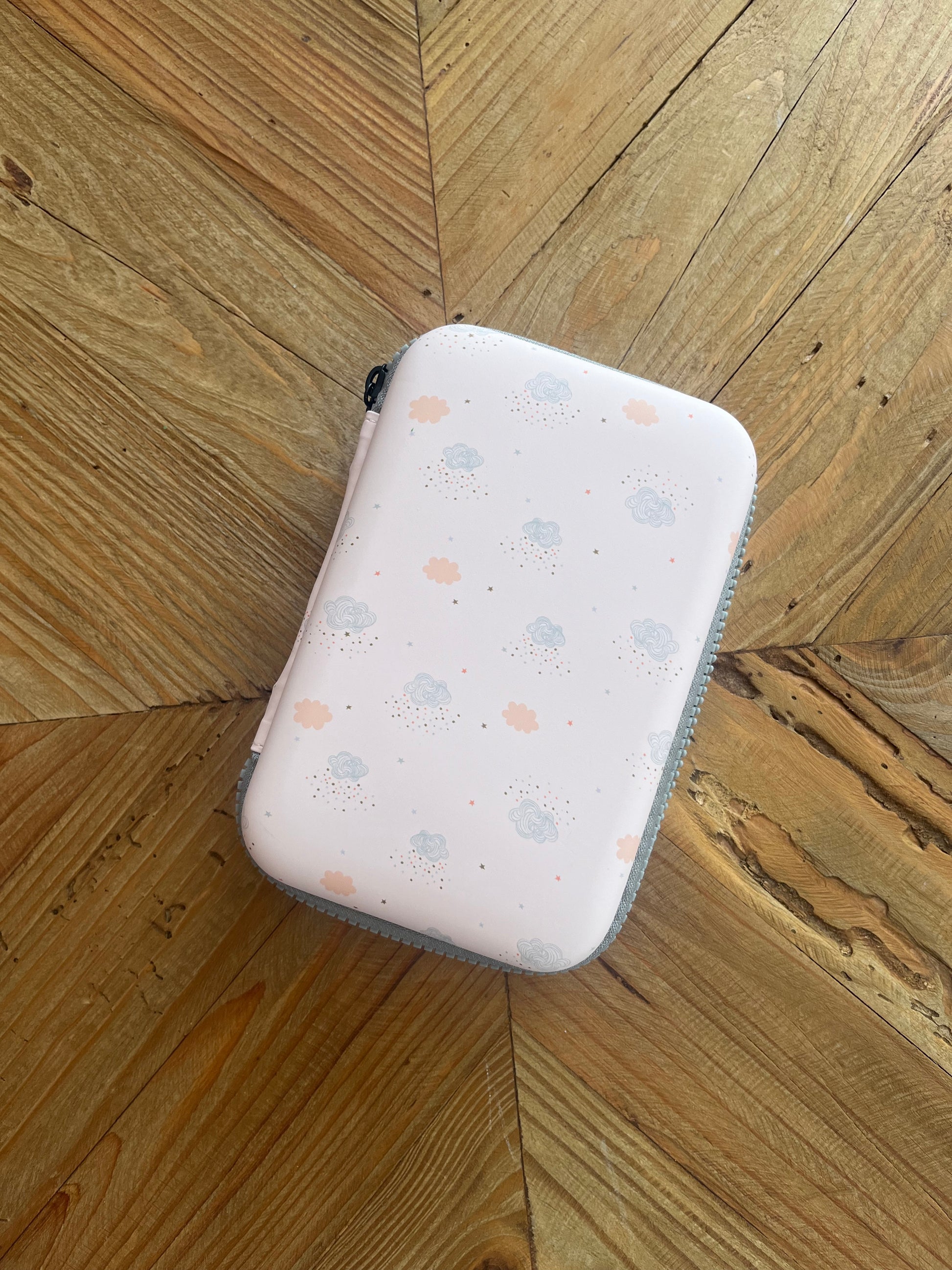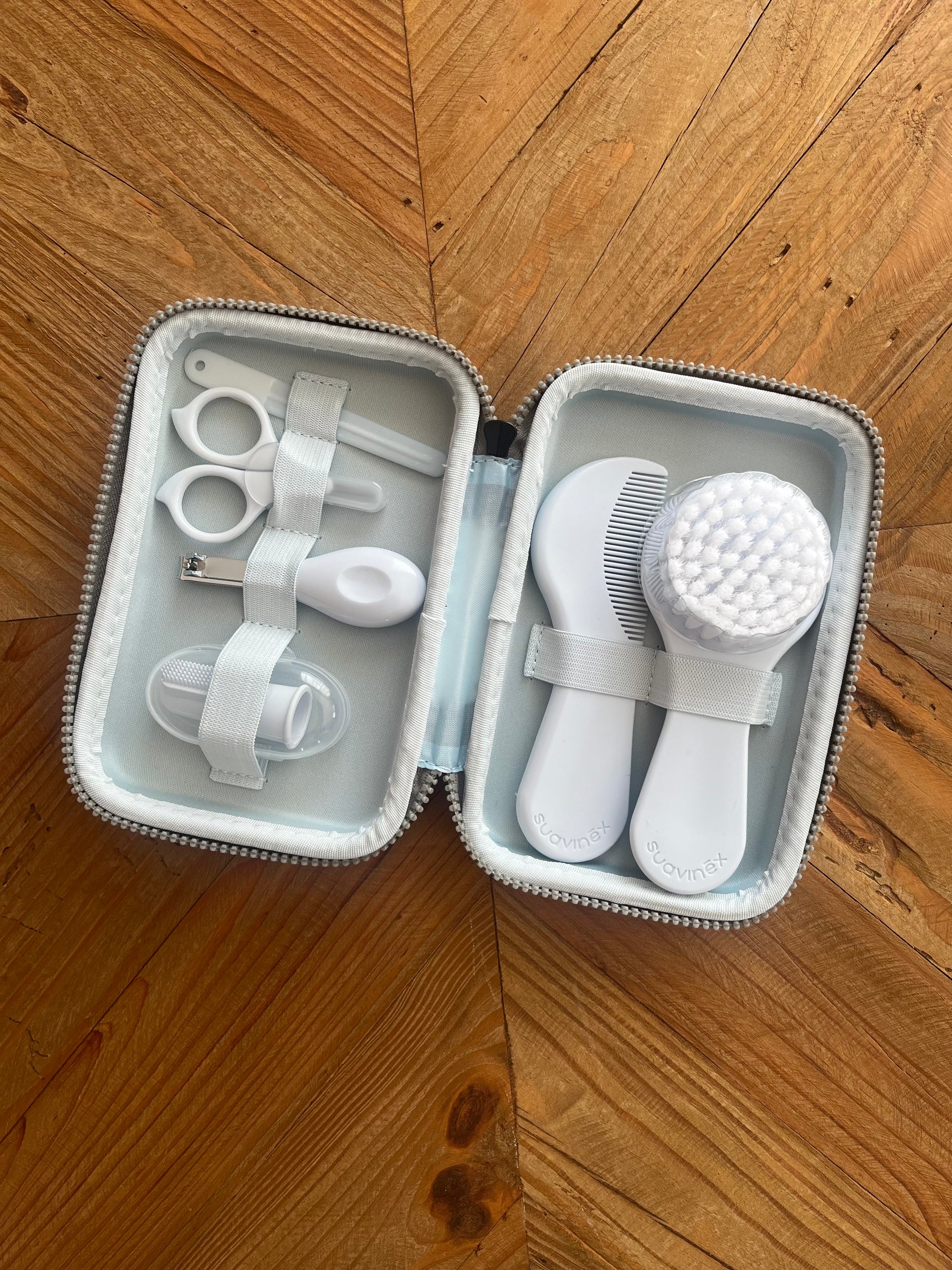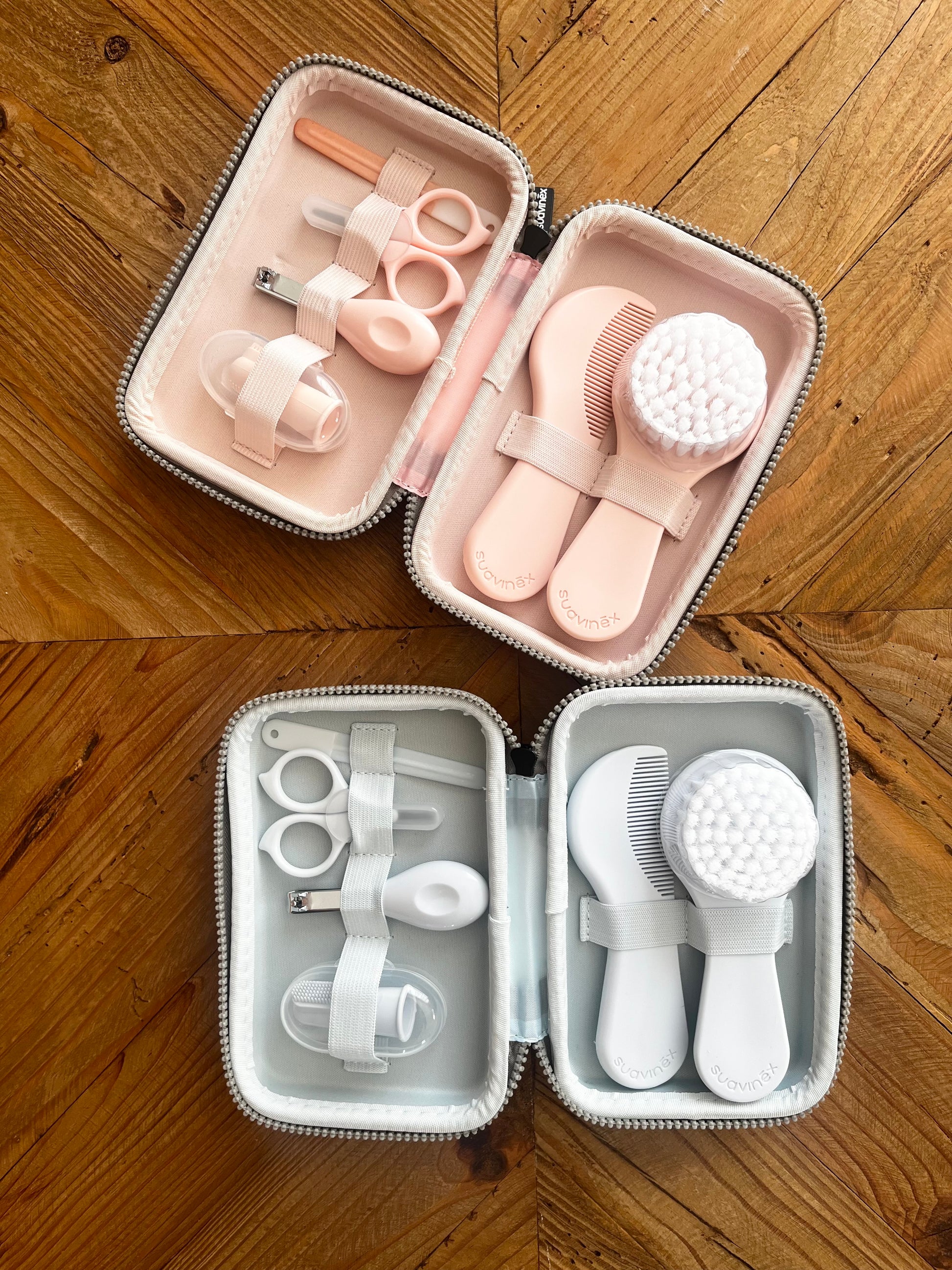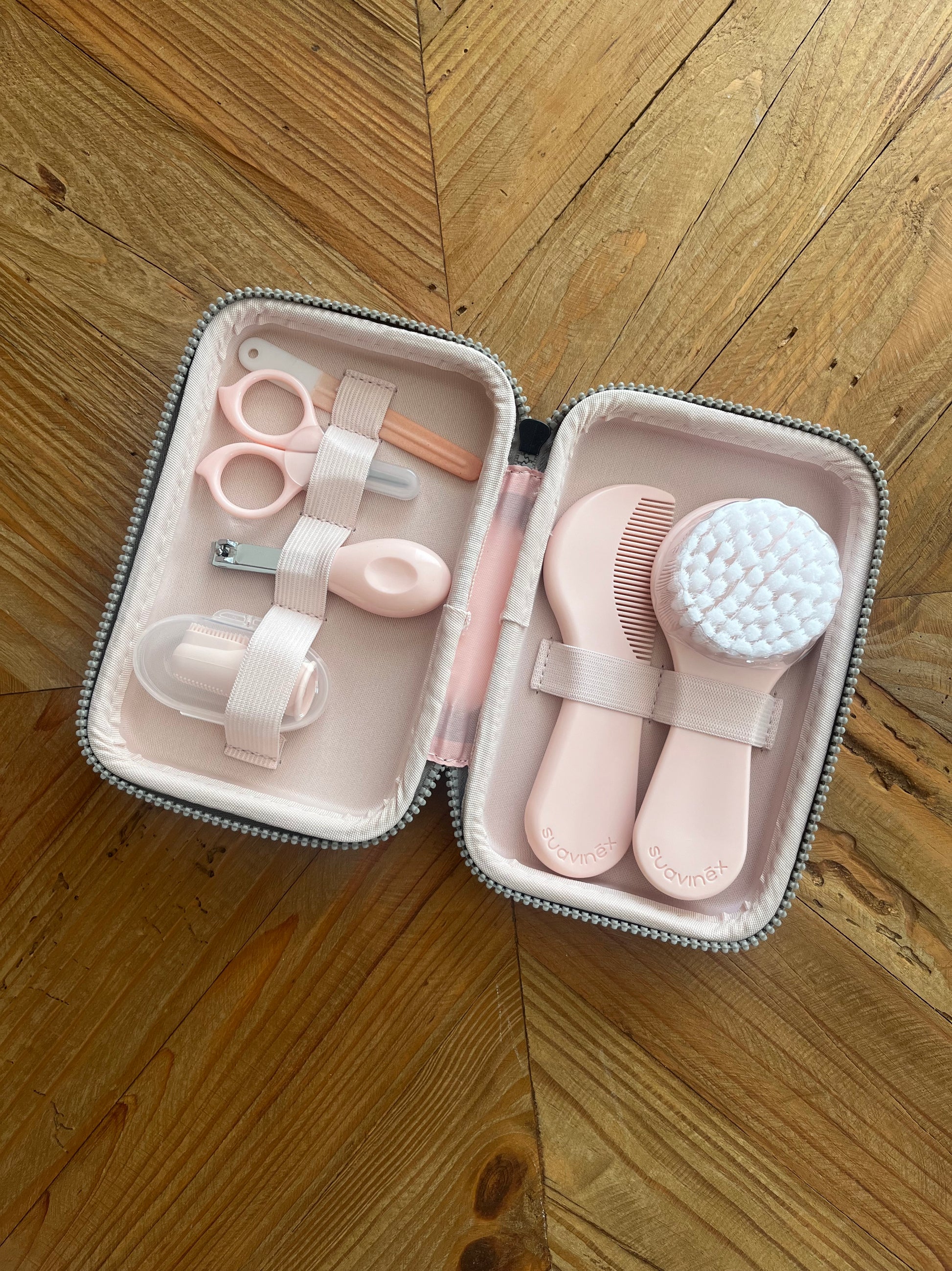 La trousse de toilette essentielle pour bébé de, Compacte et solide, elle permet un rangement hygiénique et la possibilité de le transporter facilement, Disponible en bleu ou en rose