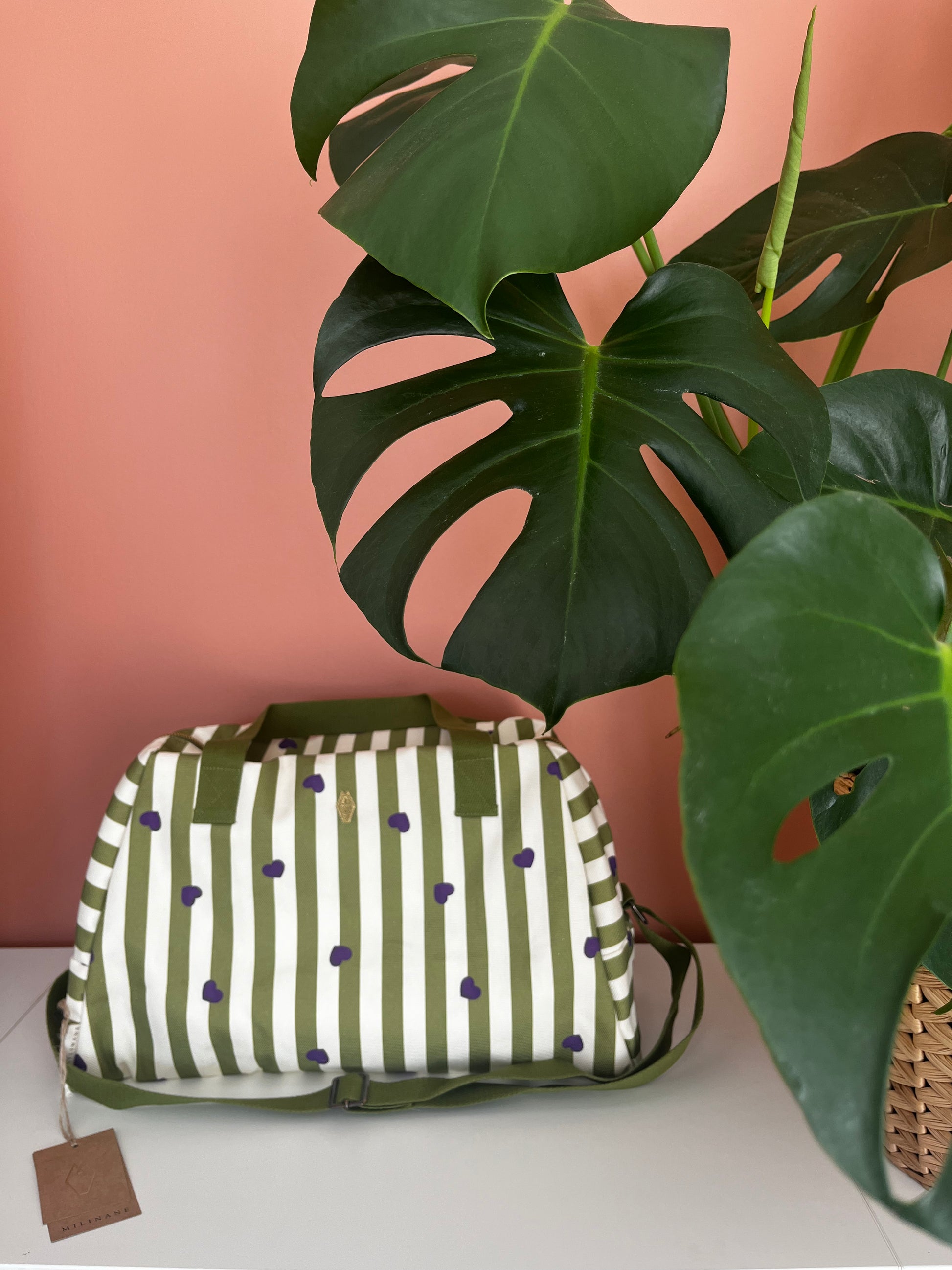 Sac à langer molletonné avec une grande ouverture à zip doré, 3 poches intérieures, 3 anses, dont une ajustable