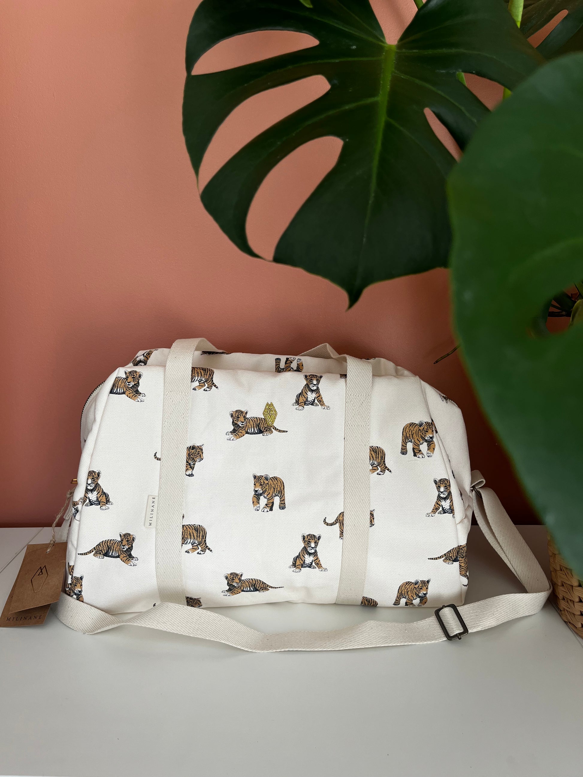 Sac à langer molletonné avec une grande ouverture à zip doré, 3 poches intérieures, 3 anses, dont une ajustable